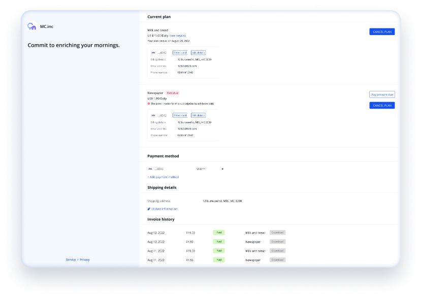 您可以安全地讓客戶在MoneyCollect託管的客戶門戶中管理其訂閱,只需分享一個鏈接。在客戶門戶中,客戶可以自行更新付款信息、調整帳單詳情、獲取發票,並自行更改訂閱,無需您手動處理他們的請求。