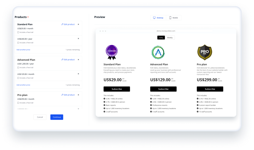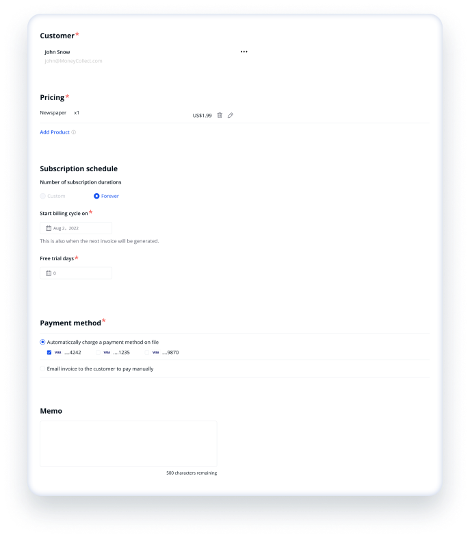 MoneyCollect訂閱服務旨在幫助企業輕鬆收取循環付款。借助我們創新的解決方案,您可以輕鬆地創建和管理自定義訂閱,從而提高公司的收入。
