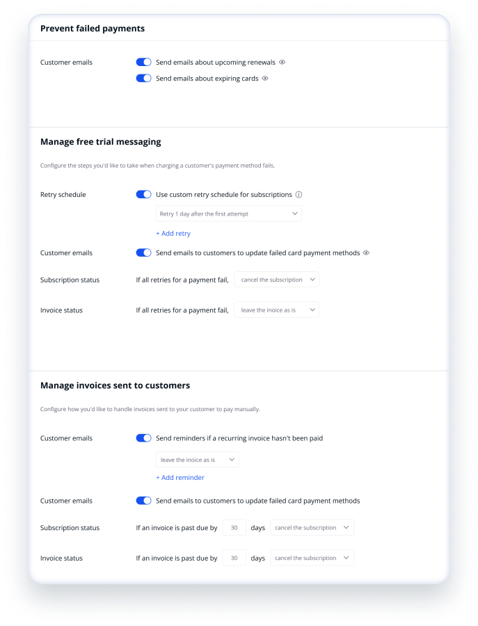 我們的智能重試設置允許在付款失敗的情況下進行多次嘗試。還提供自動發送電子郵件通知給客戶,用於失敗的付款恢復和過期信用卡更新。這些措施顯著降低訂閱流失率,提高公司收入。