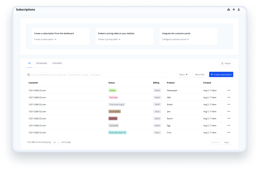 通過MoneyCollect的儀表板,您可以即時獲取用戶信息。實時追踪訂閱進度,監控帳單/付款狀態。